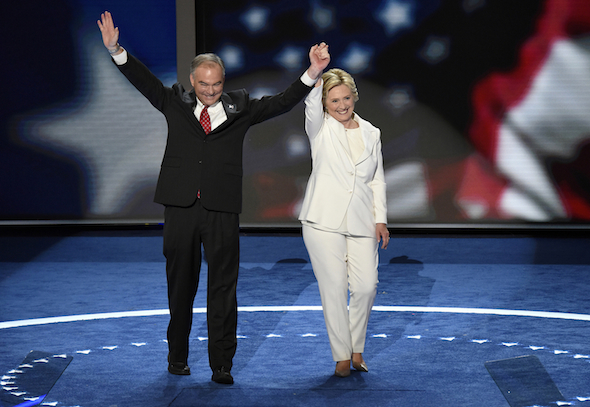 Previous Image Next Image With running mate tim Kaine after accepting the Democratic nomination With running mate Tim Kaine at the close of the Democratic National Convention